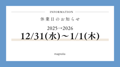 Blog 年末年始営業のご案内 今年も magnolia をご利用いただき、誠にありがとうございます。日々の暮らしの中で、香りとともに心と身体を整える時間をお届けできましたこと、心より感謝申し上げます。年内の営業は 12月30日まで...もっと見る 2025.12.25 Blog